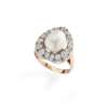 set with an ovoid (untested) pearl, in a border of old round and cushion-cut diamonds, unmarked