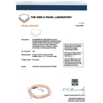 composed of a single strand of natural saltwater pearls, to a pearl and rose-cut diamond clasp; with an accompanying report by The Gem & Pearl Laboratory, dated 01.04.2022, numbered 21525, stating that the pearls are of natural saltwater origin