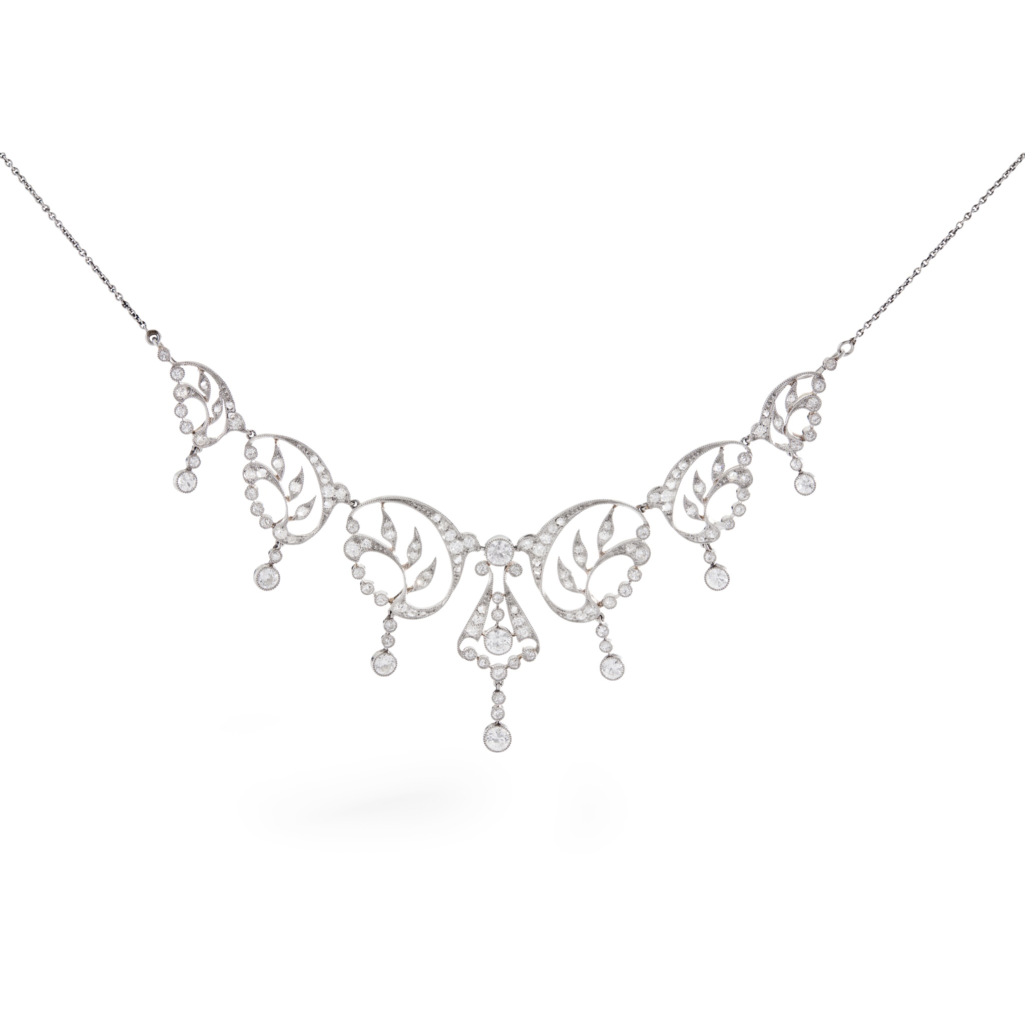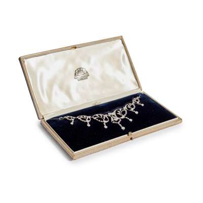of pierced scrolling design, set throughout with graduated old round and rose-cut diamonds, unmarked; in a fitted case for Hamilton & Inches Edinburgh