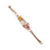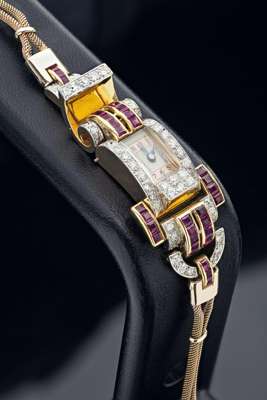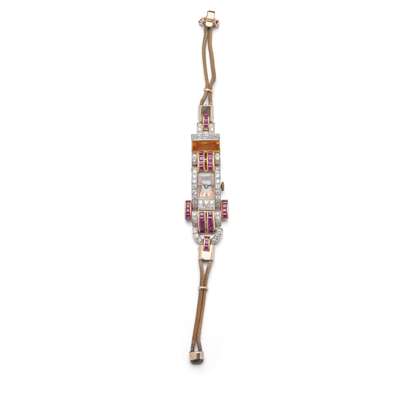 the dial with off-white ground, rose gold chapter ring with Arabic numerals, unsigned; the bezel set with circular-cut diamonds, further detail set with round-cut diamonds and calibre-cut rubies, all to a woven mesh bracelet, simple clasp, unmarked, plain Swiss movement