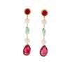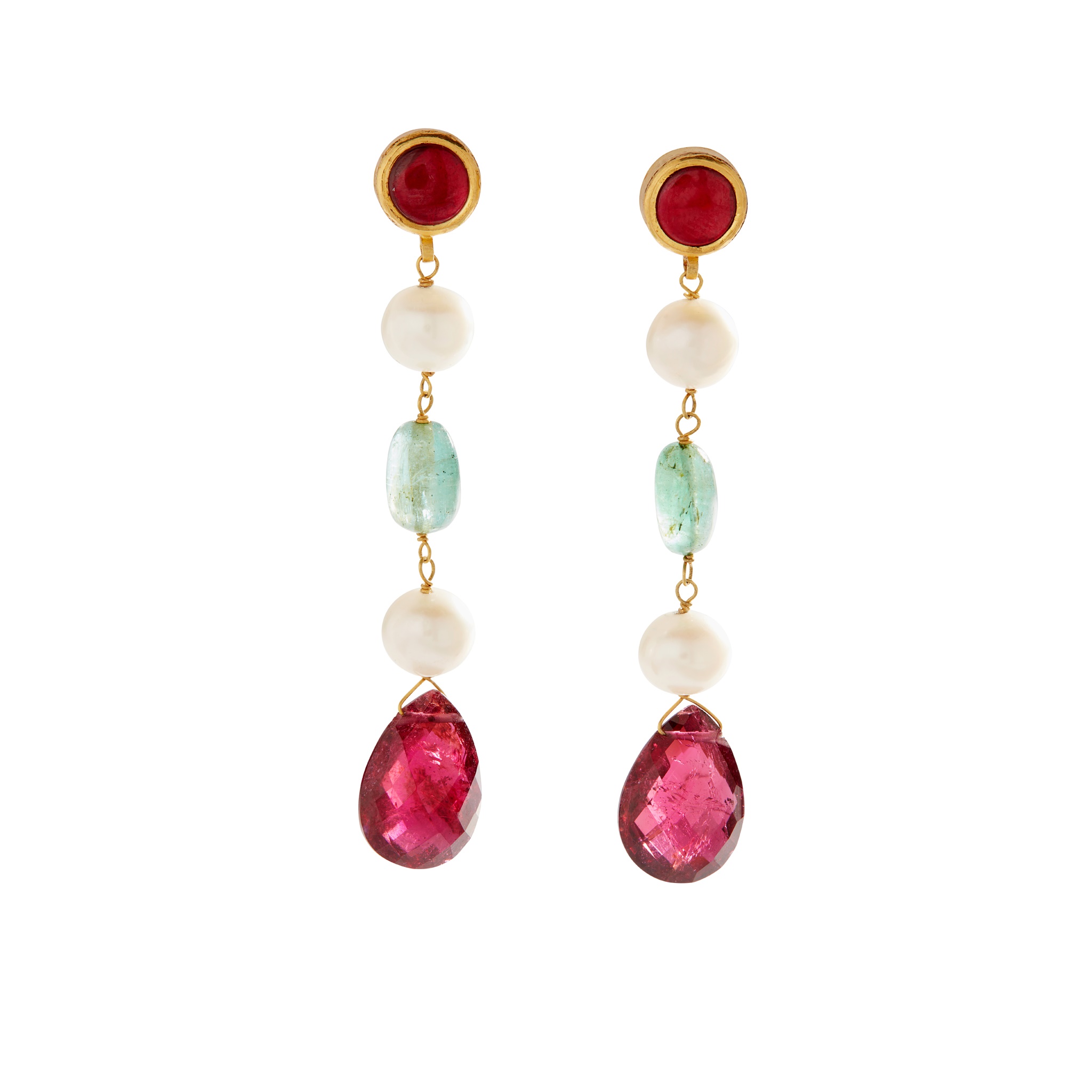 each collet-set with a red tourmaline, two cultured pearls, a polished emerald bead and a faceted red tourmaline drop, to post and butterfly fittings, modelled in 18ct gold