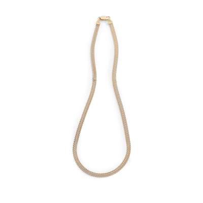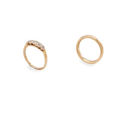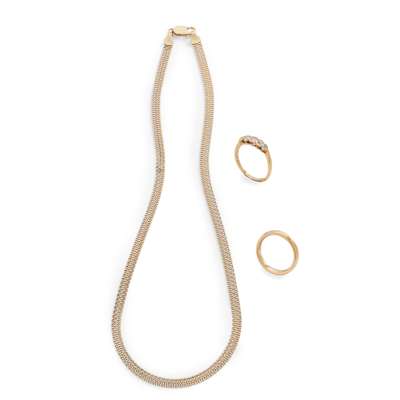 to include an 18ct gold wedding band, a five-stone diamond ring, stamped 18ct; and a fancy link necklace, stamped 750