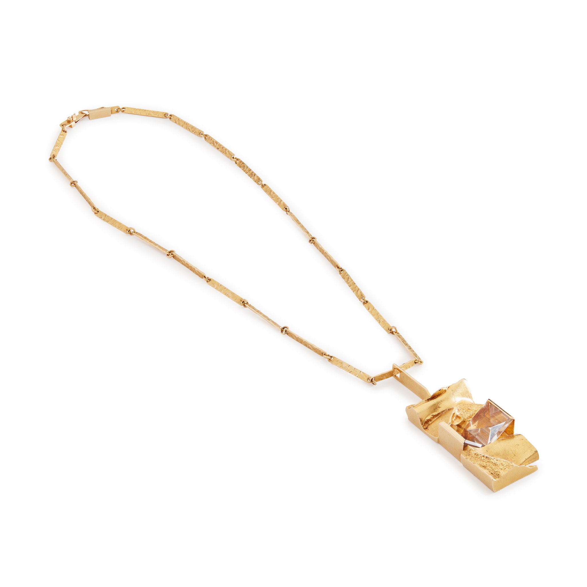 of rectangular textured design, set with a square-cut rock crystal and smokey quartz, to an integral textured link chain, stamped 750 MADE IN FINLAND