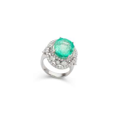 claw-set with a large oval mixed-cut emerald, in a pierced border of graduated round brilliant, marquise and pear-shaped diamonds, to a plain band, stamped 18K 750