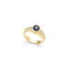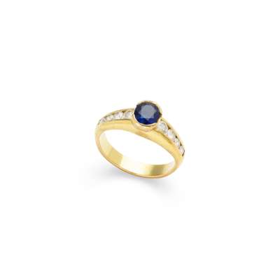 part collet-set with an oval-cut sapphire, each shoulder channel-set with four graduated round brilliant-cut diamonds, unmarked