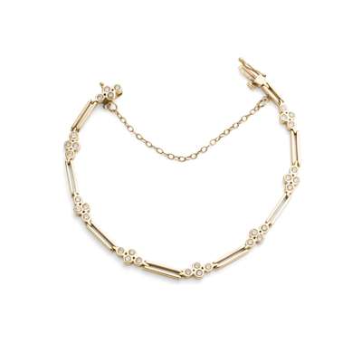 collet-set with clusters of four round brilliant-cut diamonds and pierced rectangular links, stamped 18k