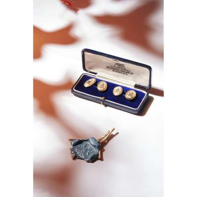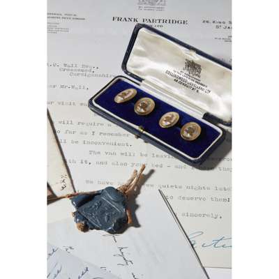 During the summer of 1941 Her Majesty Queen Mary was looking to store the royal silver collection, ‘45 cases’ of it, outside of London and safely away from the Blitz. The cases found their way to Mr. Wall, who had enough room to store them without ‘inconvenience’ so the correspondence tells us. They travelled by van on 17 June 1941 and were safely under the protection of Mr. Wall until the end of the war. As a token of her gratitude, Queen Mary gifted the cufflinks along with a handwritten letter to express her ‘gratitude’ for the ‘safe keeping’ in ‘all these long years of war’.