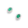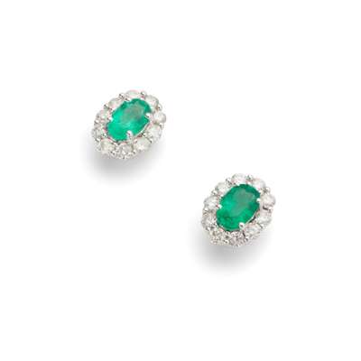 each claw-set with an oval-cut emerald in a border of round brilliant-cut diamonds, post fittings, stamped 18k