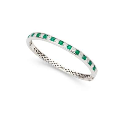 of hinged design, channel-set with alternating cushion-cut diamonds and emeralds, unmarked