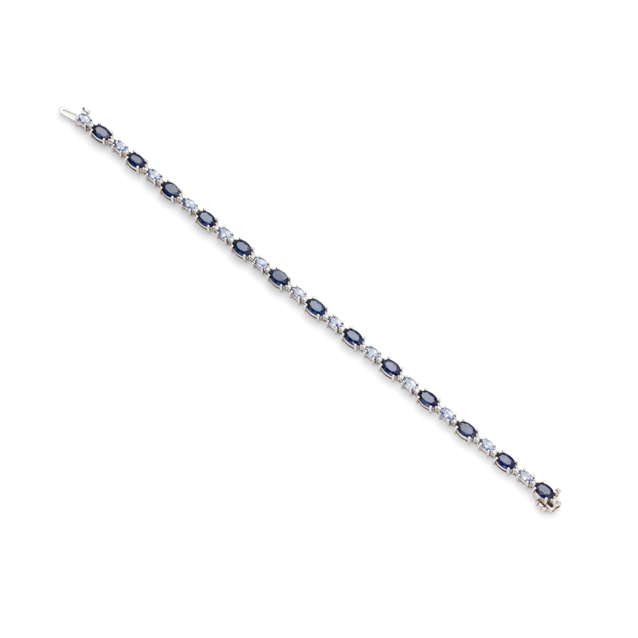 claw-set with alternating oval-cut sapphires and round brilliant-cut diamonds, stamped 14k