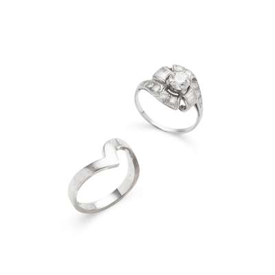 claw-set with a round brilliant-cut diamond, in a scrolling surround set with baguette and round brilliant-cut diamonds, unmarked; together with a modern fitted wedding band, modelled in 18ct gold