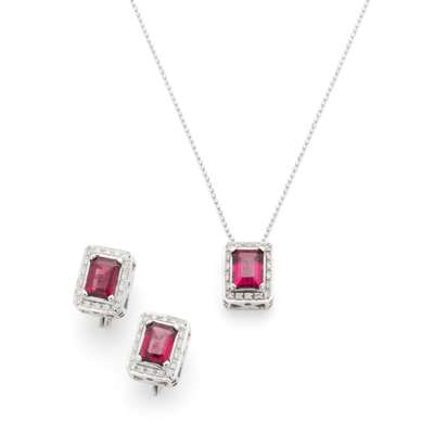 A pair of garnet and diamond earrings and a matching pendant