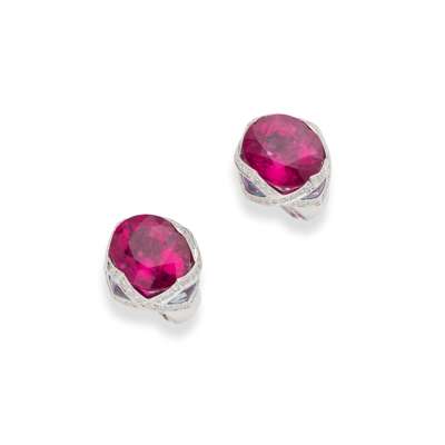 each claw-set with an oval-cut pink tourmaline, in a scrolling border of brilliant-cut diamonds and fancy-cut blue topaz, to clip fittings, stamped Arfan Paris 750