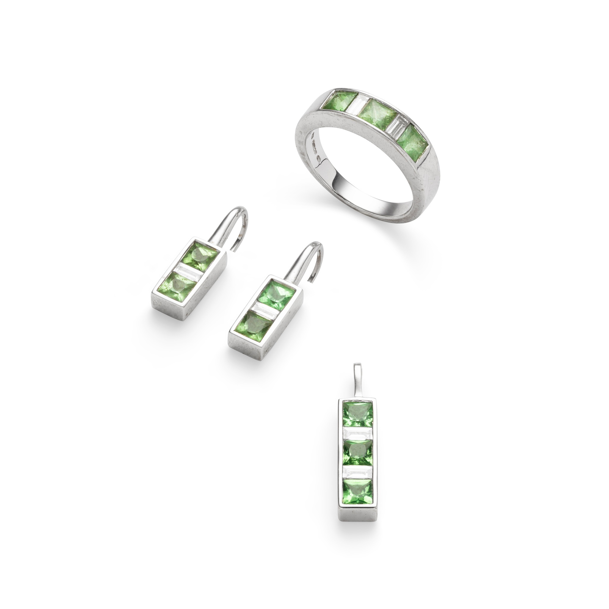 including a ring, pendant and a pair of earrings, each channel-set with alternating princess-cut demantoid garnets and baguette-cut diamonds, all modelled in 18ct gold