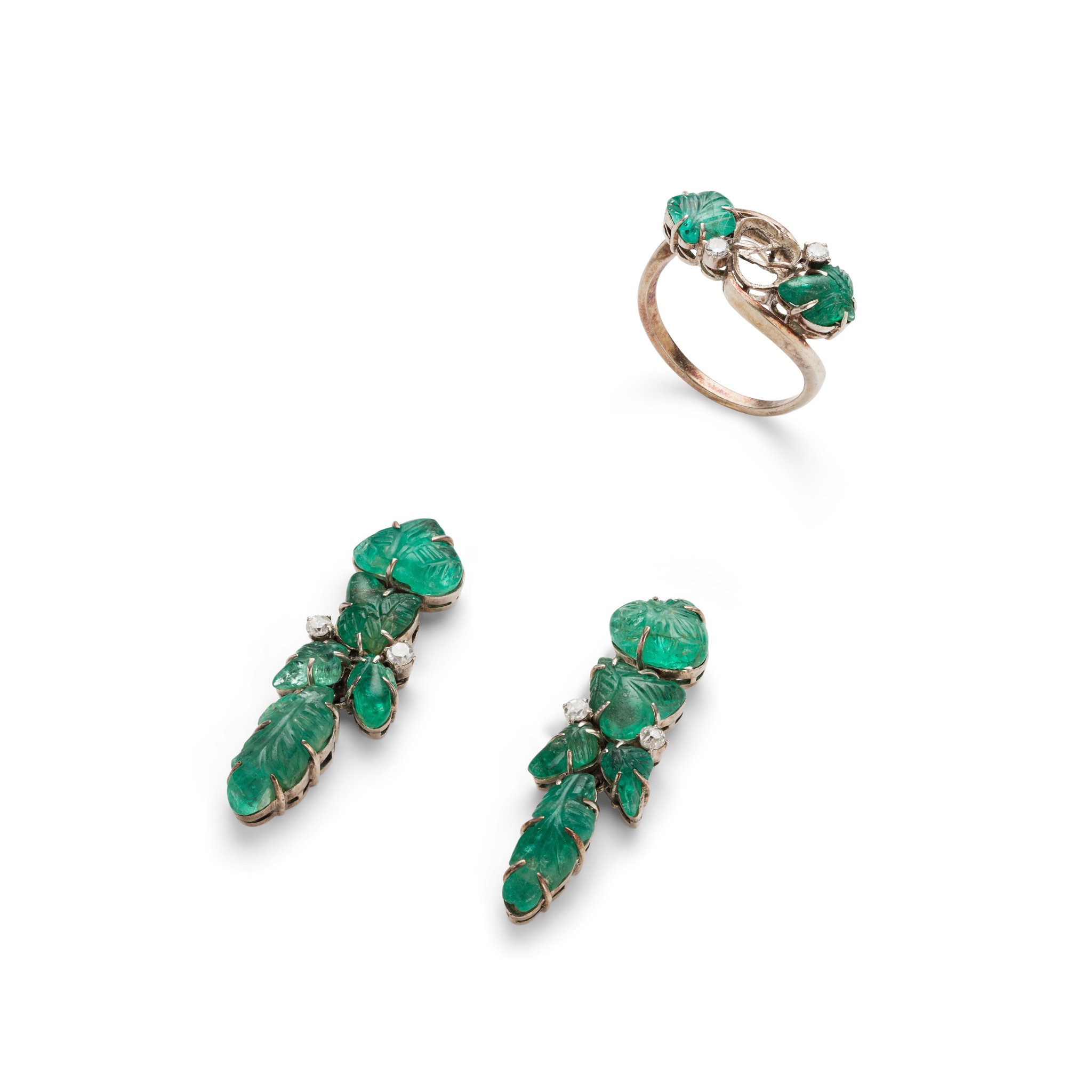 each set with five carved emeralds and two small round-cut diamonds, to screw back fittings, stamped 9ct; together with a matching ring (one emerald lacking), unmarked