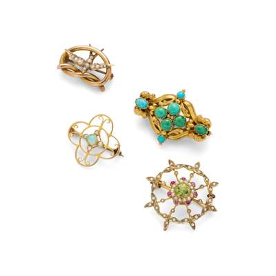 including a circular peridot, ruby and seed pearl brooch, stamped 9ct; a pierced quatre-foil opal and seed pearl brooch, unmarked; a seed pearl brooch modelled as a knot and swallow, stamped 9ct; and a turquoise brooch of scrolling design, unmarked