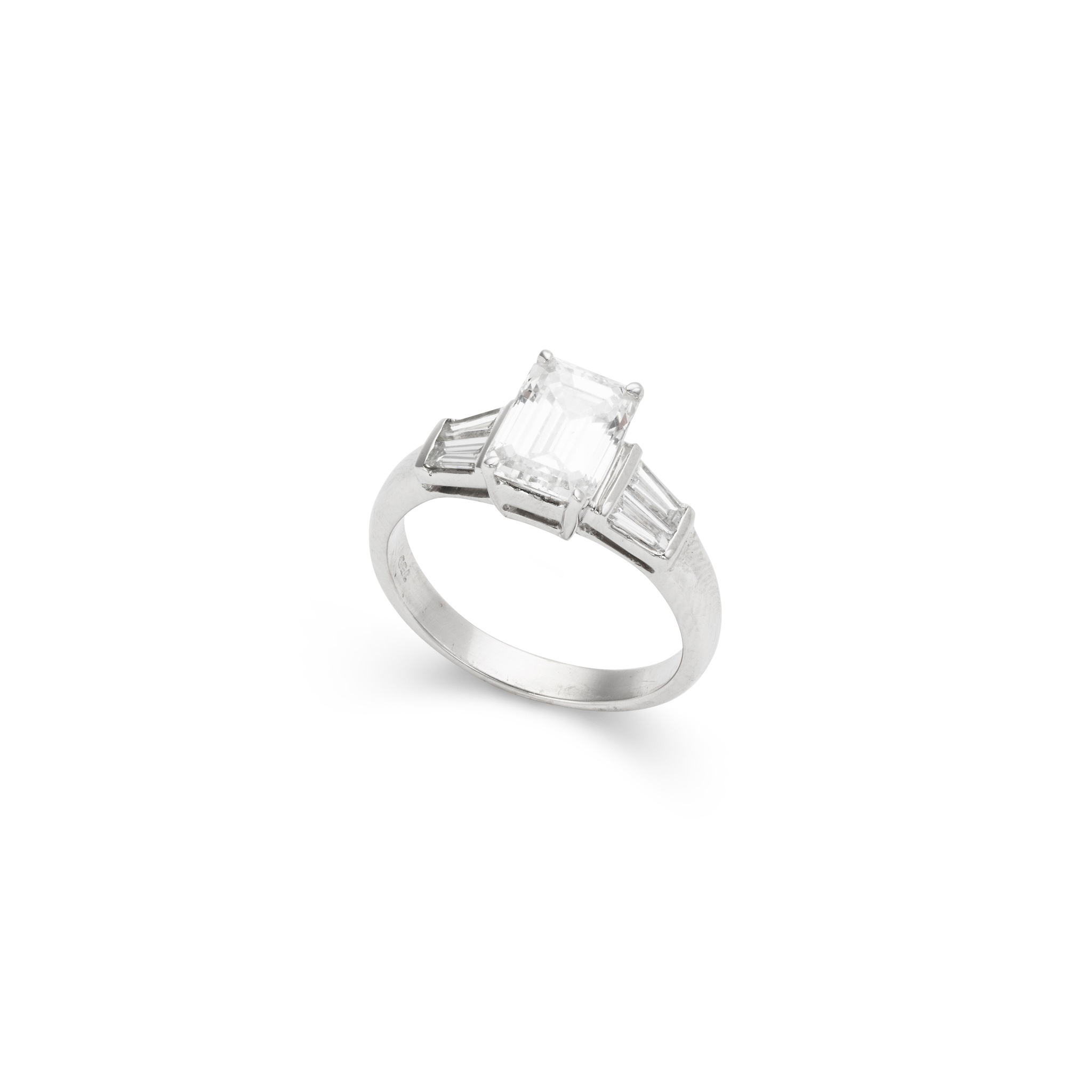 claw-set with a cut-cornered rectangular-cut diamond, each shoulder set with two tapered baguette-cut diamonds, stamped 750