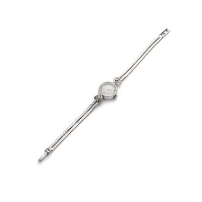 the circular dial with baton indicators, each shoulder set with two round brilliant-cut diamonds, to an integral woven strap and fold-over clasp, modelled in 18ct gold
