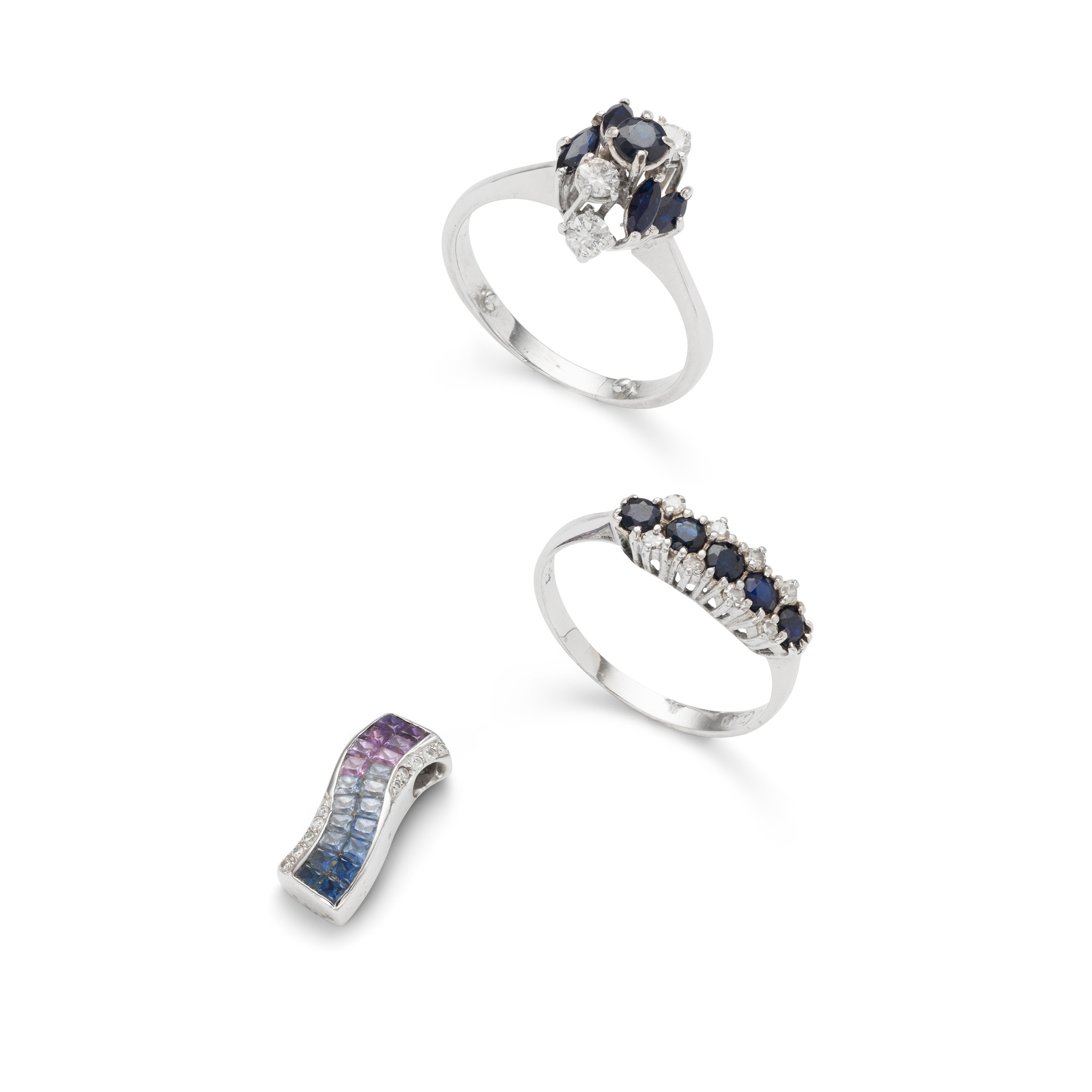 to include a sapphire and diamond cluster ring, to a plain band, unmarked; a five-stone sapphire ring with eight-cut diamond detail, modelled in 18ct gold; and a blue and purple sapphire pendant with diamond detail, stamped 750