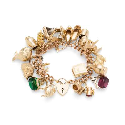 composed of double curb links, suspending various charms including a tea-pot, hedgehog and ballet-slippers etc, modelled in 9ct gold