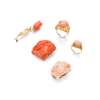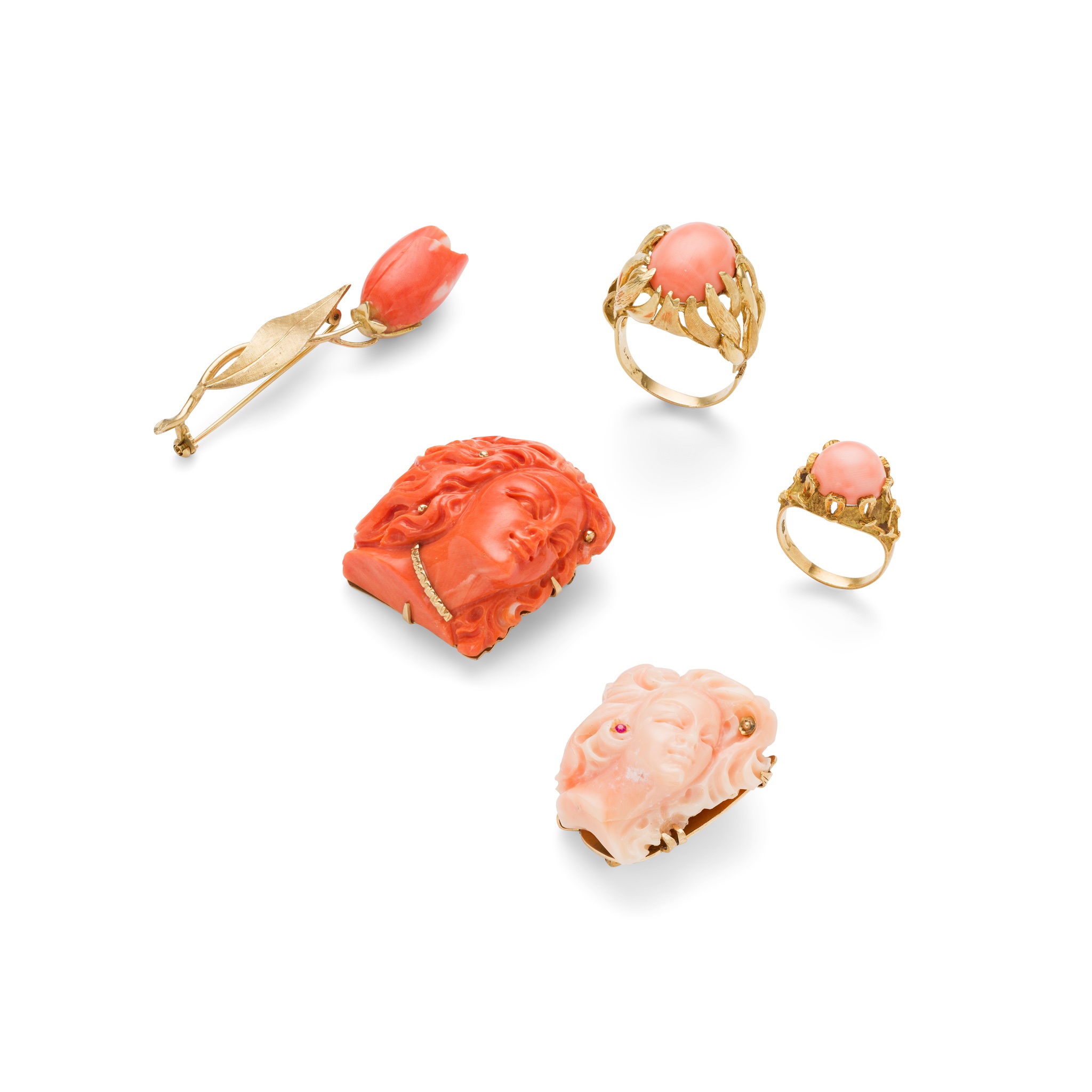including two carved coral brooches modelled as women in profile, stamped 750; another modelled as a rose, stamped 750; two rings, each set with a cabochon coral, stamped 750