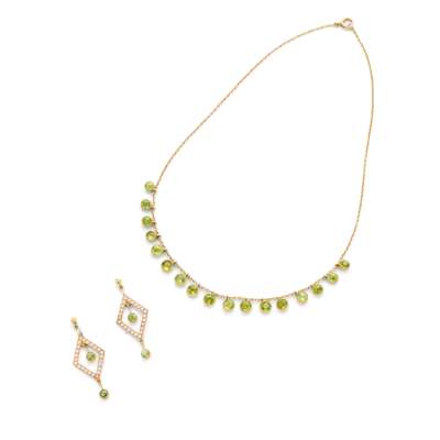 the trace-link chain suspending seventeen millegrain-set circular-cut peridots, unmarked; together with a pair of associated seed pearl and peridot pendent earrings, stamped 9ct