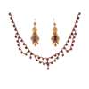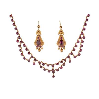 the necklace of swag design, set throughout with foil-backed circular-cut garnets, stamped 9ct; together with a pair of foil-backed garnet pendent earrings, with engraved detail, hook fittings, unmarked