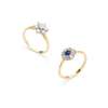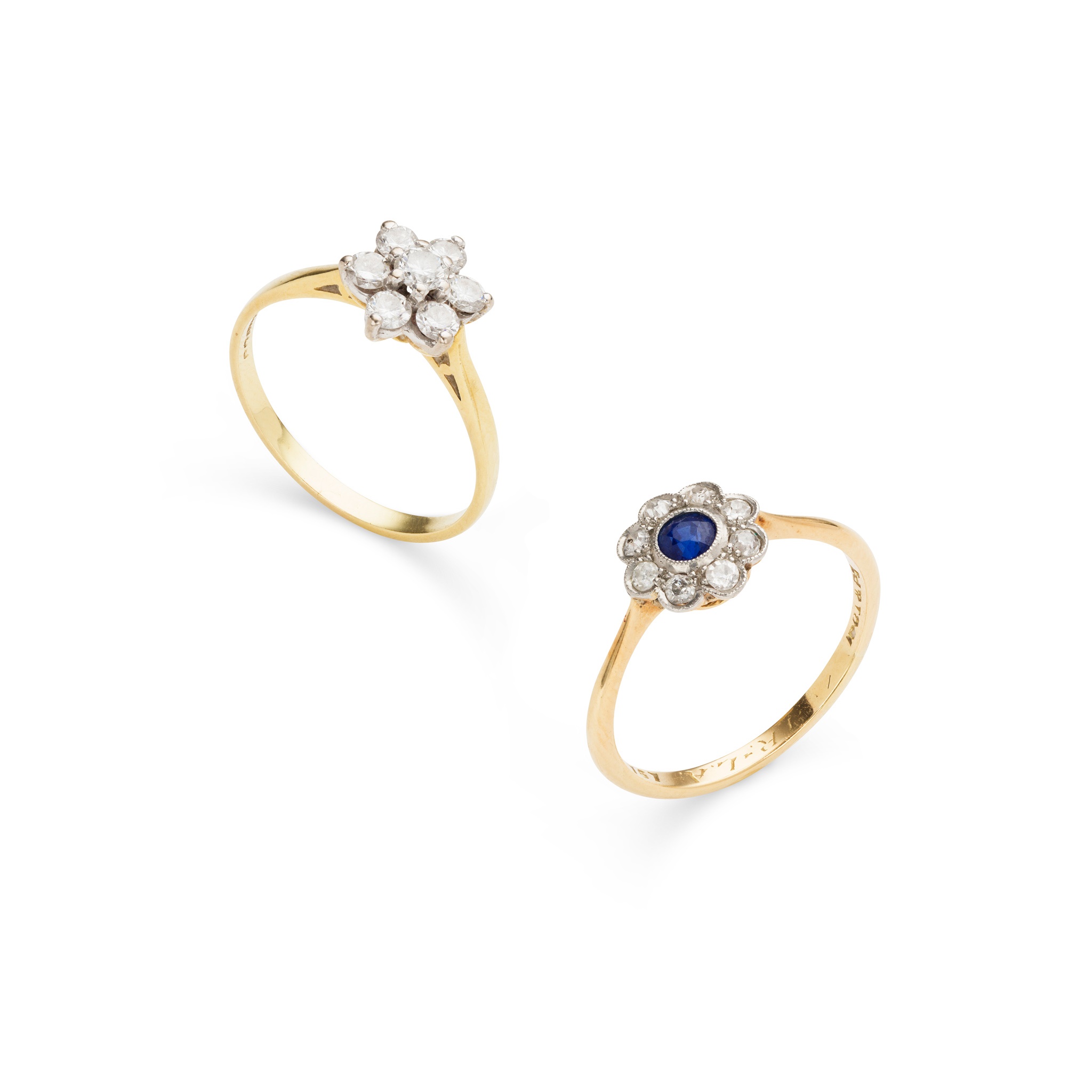 claw-set with seven round brilliant-cut diamonds, to a plain 18ct gold band; together with a sapphire and diamond cluster ring, stamped 18ct & PT