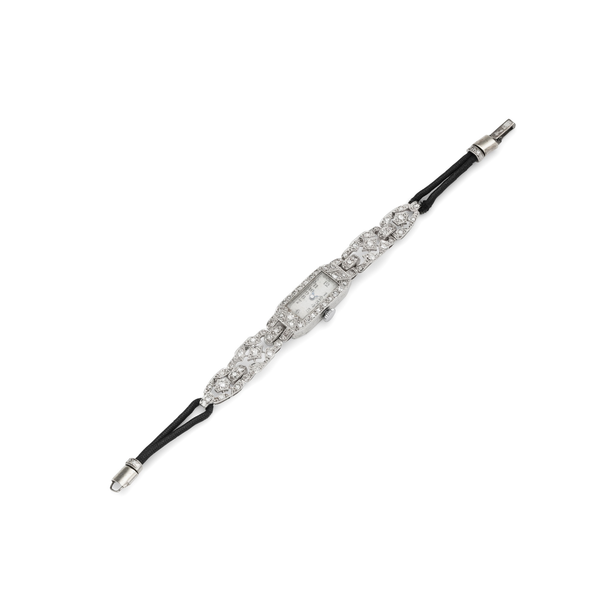 the rectangular dial with Arabic numerals, the bezel and shoulders set throughout with eight-cut diamonds, case stamped PLATINUM, to a cord bracelet and foldover clasp