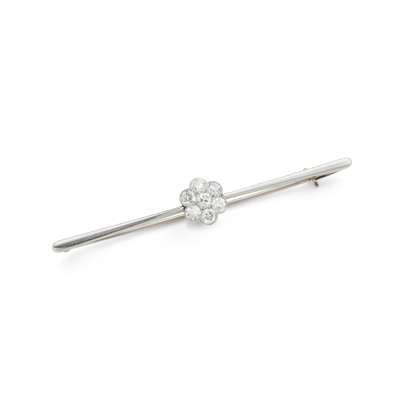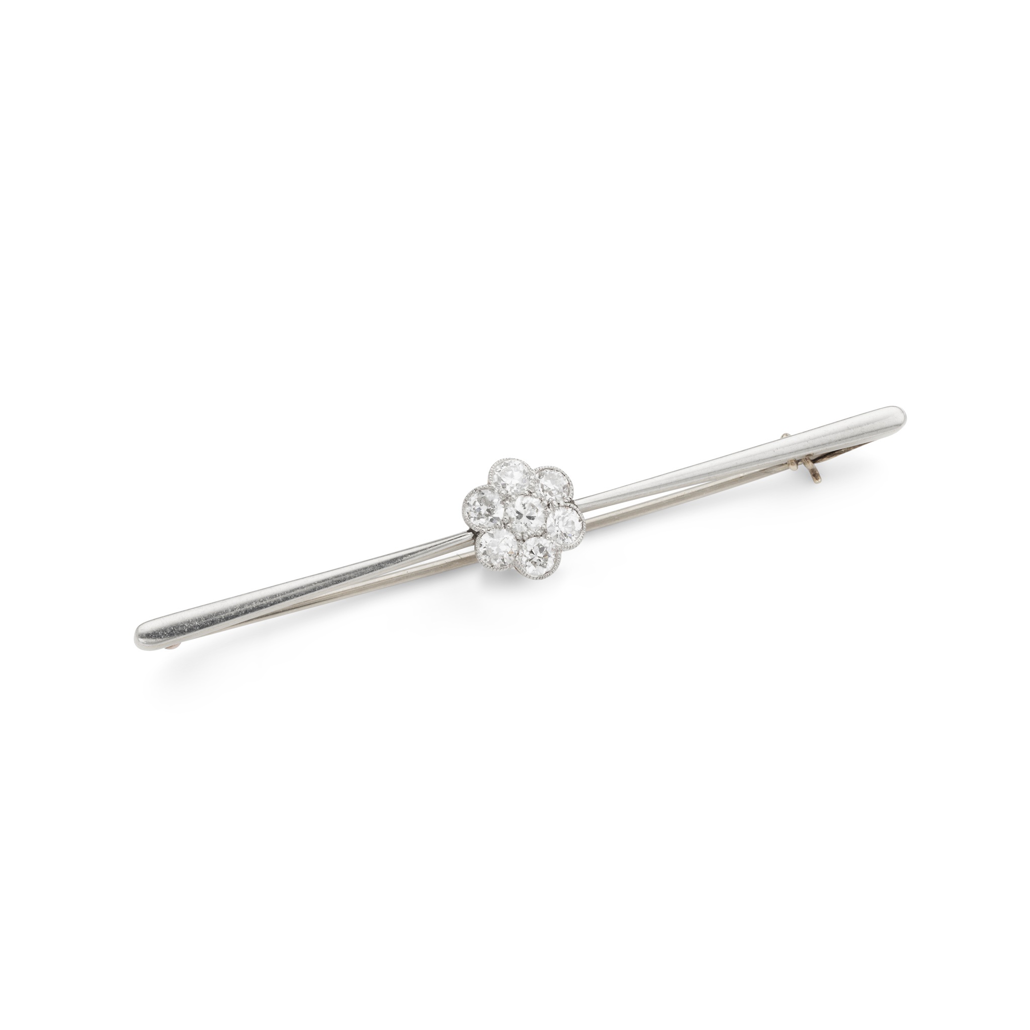 the cluster millegrain-set with seven old round-cut diamonds, to a plain bar brooch, stamped 15ct