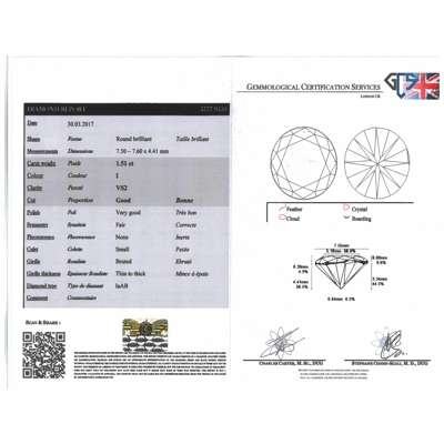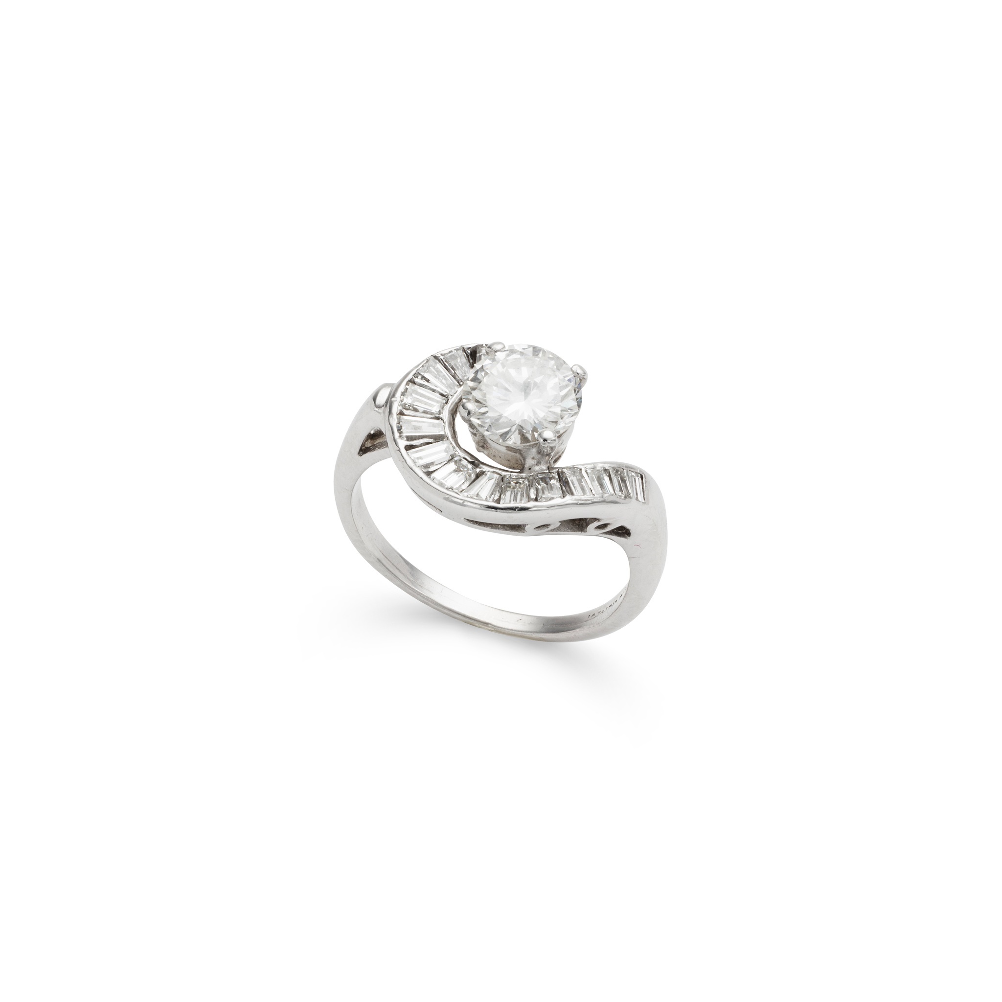 claw-set with a round brilliant-cut diamond, within a scrolling surround set with graduated baguette and tapered baguette-cut diamonds, indistinctly marked PLAT; with accompanying report by Gemmological Certification Services, numbered 5777-9533, dated 30.03.17, stating that the principal diamond weighing 1.51cts, is I colour and VS2 clarity, showing no fluorescence