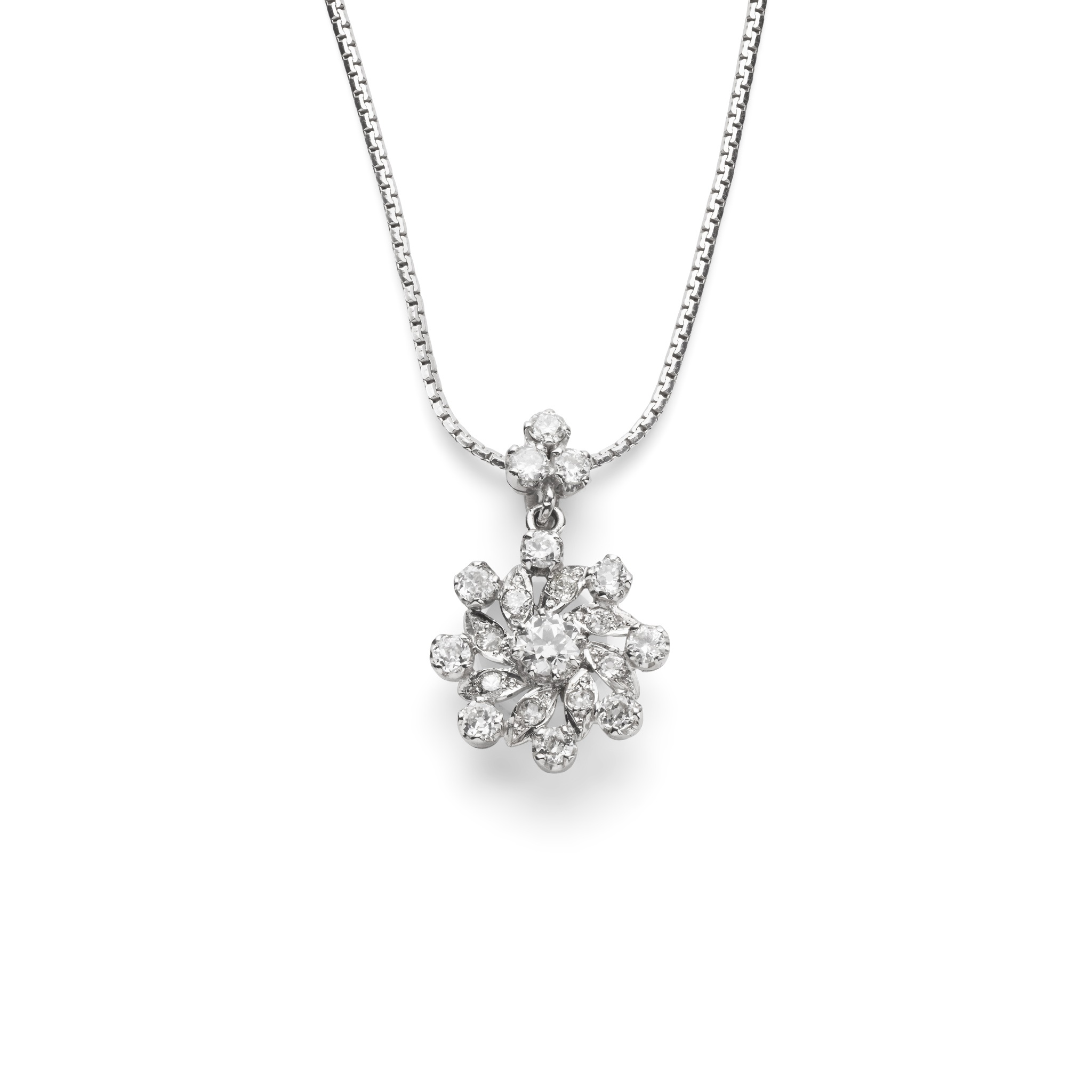 claw-set with a central old round-cut diamond, in a border of smaller old round and eight-cut diamonds, unmarked; to an 18ct gold woven trace-link chain