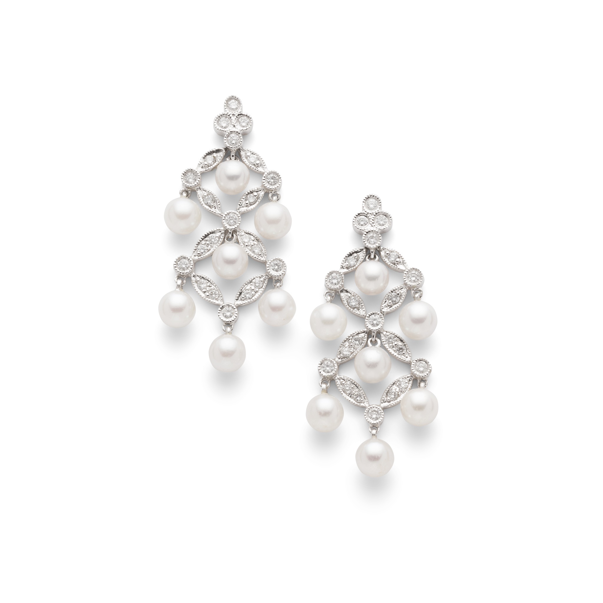 each set throughout with small round brilliant-cut diamonds, suspending seven small cultured pearls, to post and butterfly fittings, unmarked