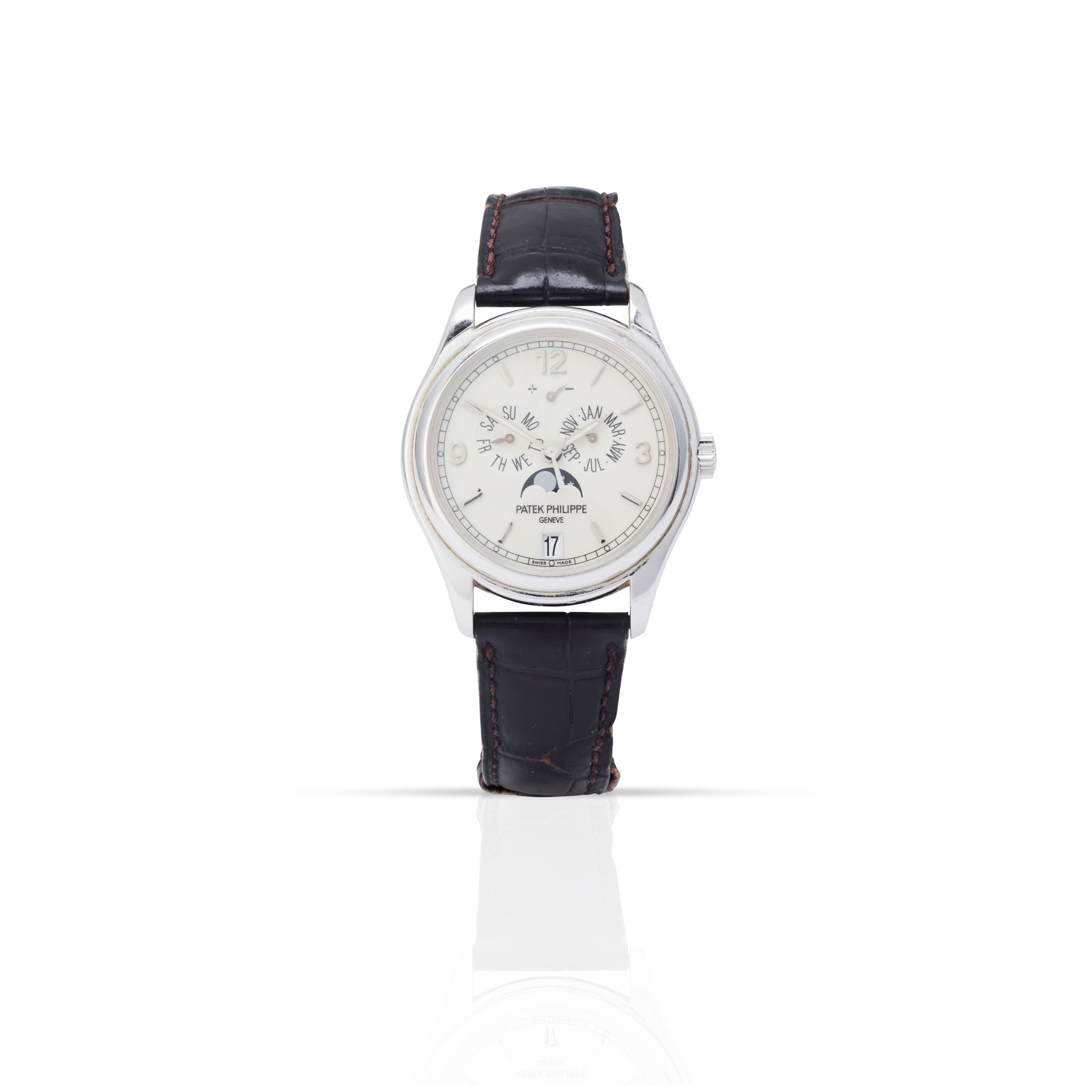Annual Calendar model 5146G, the case with European convention mark for 18ct white gold, signed Patek Philippe calibre 315/299 automatic movement numbered 3420587, round white dial with applied Arabic numerals and baton hour markers, sunken subsidiary dials at 3 and 9 for months and days respectively, moonphase aperture at 6, date aperture also at 6, railroad outer seconds track in black, lume-filled hands, centre seconds hand, exhibition caseback, on a signed Patek Philippe crocodile strap with signed 18ct white gold deployant clasp, in box
