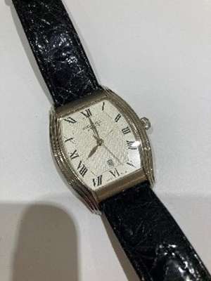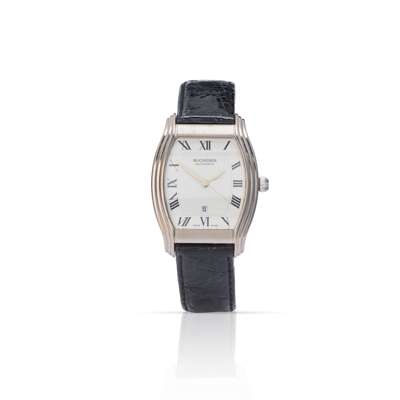 Archimedes model, case with European convention mark for 18ct (white) gold, automatic movement, white dial with Roman numerals in black, date aperture at 6, leaf-style hands, ribbed case edge, the caseback signed and with No. .05, 2000-004, on a black crocodile strap with clasp with B and marked 750, no box and papers