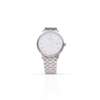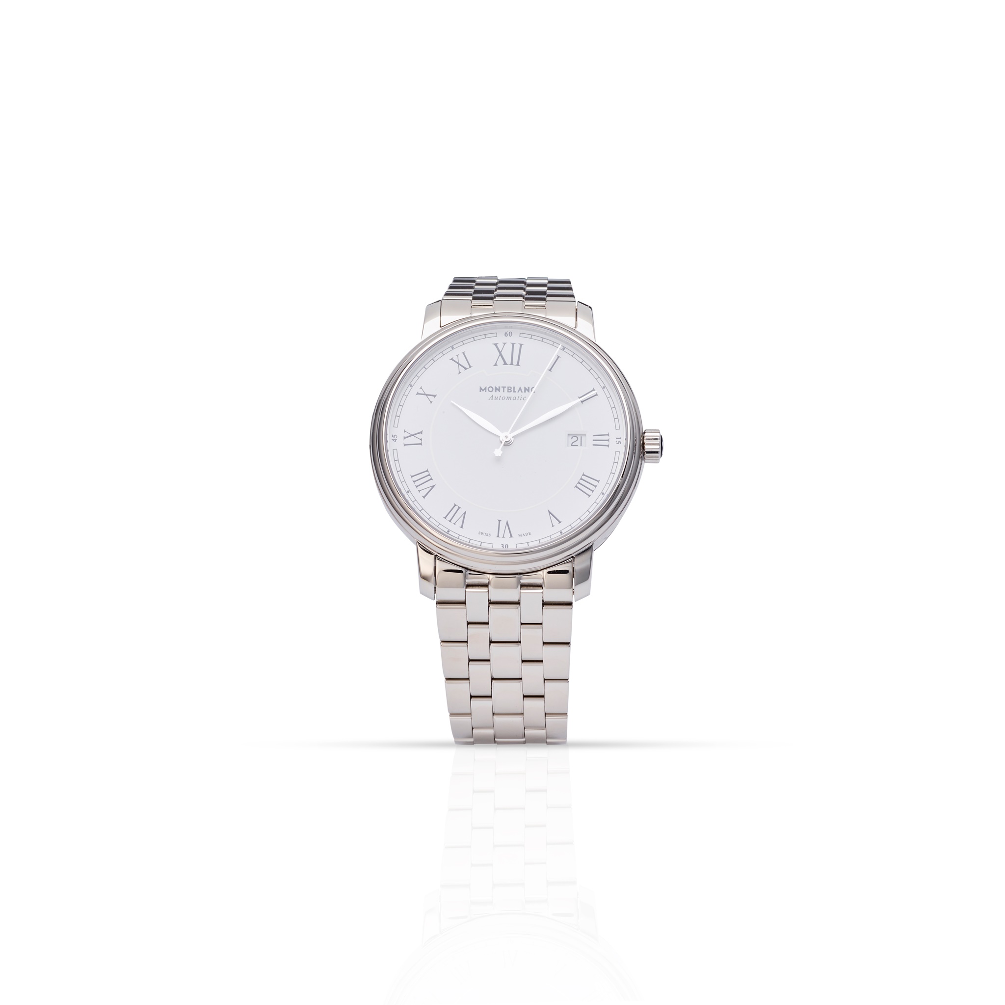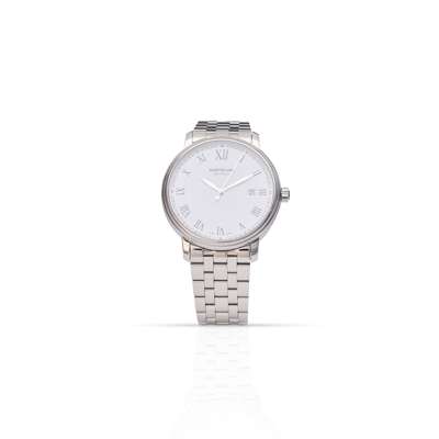 Tradition model 7334, stainless steel case, automatic movement, round white dial with Roman numerals in black, date aperture at 3, railroad outer seconds track in black, leaf hands, centre seconds hand, exhibition caseback with model and serial numbers, on a stainless steel bracelet strap with concealed clasp, in box, with outer box, with papers