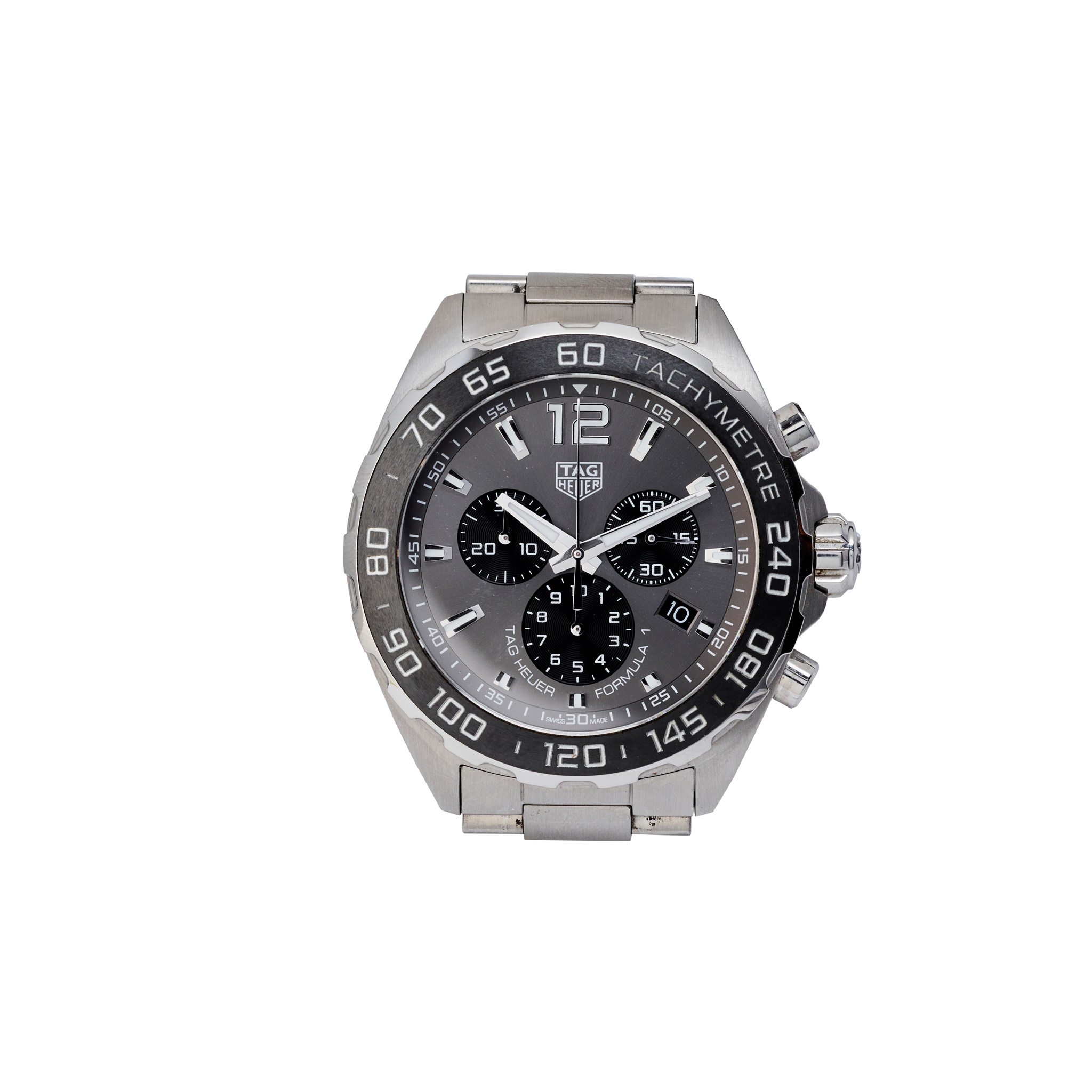 Formula 1 model CAZ1011, stainless steel case, quartz movement, round dark grey dial with applied stainless steel-edged Arabic 12 and baton hour markers, three subsidiary dials at 3, 6 and 9 for small seconds, 10ths of a second and 30 minute register respectively, date aperture at 4, outer seconds track in white with Arabic numerals, stainless steel hands with lume inserts, black bezel with tachymeter scale, screw-down crown with TAG Heuer logo and flanked by twin cylindrical push buttons, with model and serial numbers to the caseback, on a stainless steel bracelet strap with signed deployant clasp with FAA074-0 and Y-N8, no box and papers