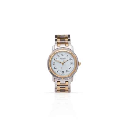 Clipper model, stainless steel case, quartz movement, round white dial with Arabic numerals in black, date aperture at 3, dot outer seconds track, gold-coloured bezel, the caseback with Hermès logo, on a stainless steel and gold-plated bi-colour strap, no box and papers