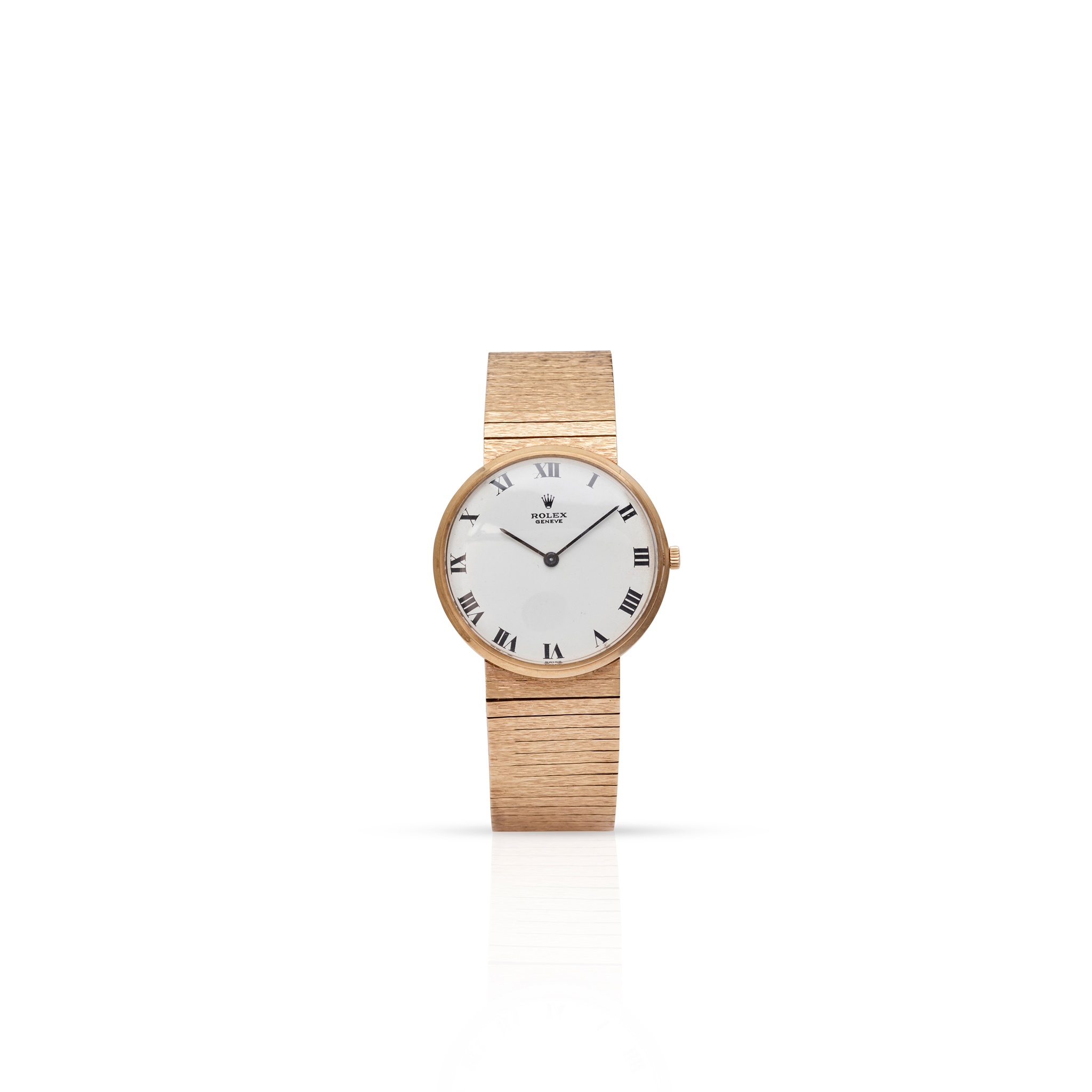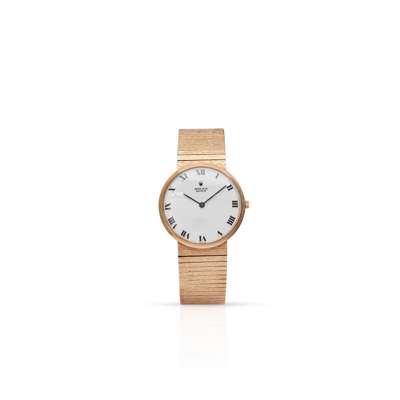 9ct gold case, signed Rolex calibre 1600 manual wind movement, round white dial with Roman numerals in black, pencil hands, crown with coronet, on an integrated bracelet strap, with a foldover clasp with coronet and hallmarked for 9ct gold, no box and papers