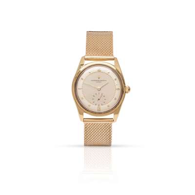 c.1950s, signed round dial with applied Arabic 12 and 6 and square hour markers, small seconds at 6, inner dot seconds track, pencil hands, on a generic mesh bracelet strap with a foldover clasp, unmarked, no box and papers
