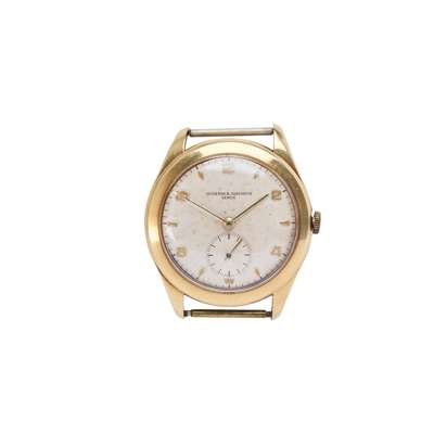 case marked 750 18K and with Swiss Helvetia head hallmark, signed Vacheron Constantin calibre P453/3B manual wind movement numbered 492990, round white dial with applied gold Arabic numerals and rhombic hour markers, sunken small seconds at 6, outer seconds track, gold pencil hands, metal crown, no strap, no box and papers