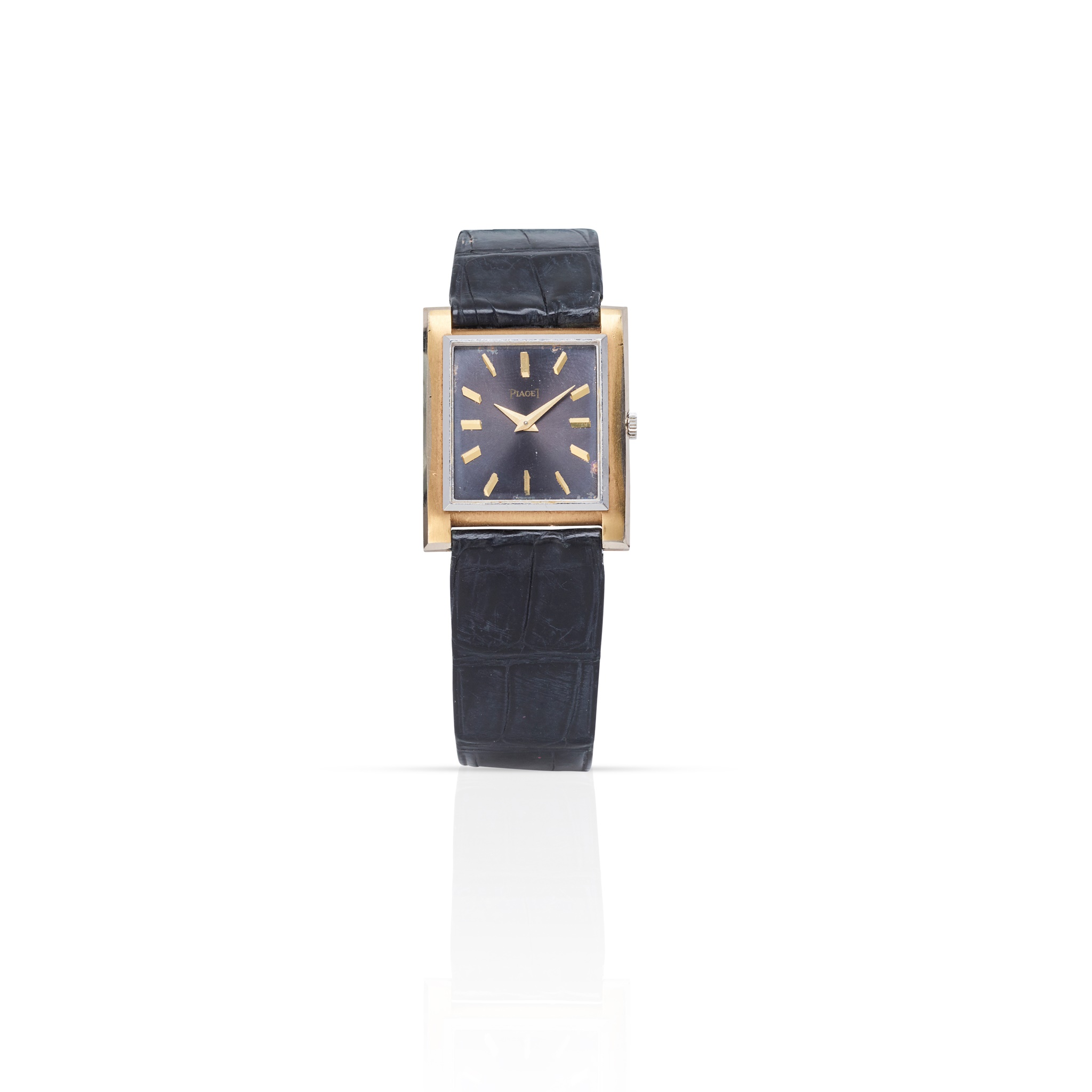 model 9057, manual wind movement, black rectangular dial with applied gold baton hour markers, gold sword hands, white metal bezel, on a signed Piaget black strap, possibly crocodile, with Piaget clasp marked 750, no box and papers