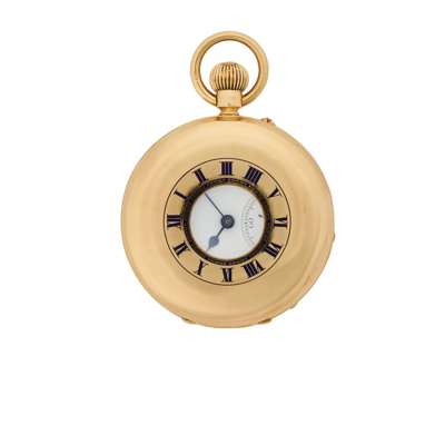 half hunter, keyless wind, case with full 18ct gold hallmarks for London 1912, signed 3/4 plate movement numbered 371443, round white enamel dial with Roman numerals in black, sunken small seconds at 6, outer seconds track in black, blued steel leaf hands, casefront with Roman numerals in blue enamel around central aperture, caseback with engraved monogram possibly RPK