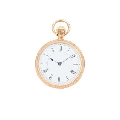 open face, keyless wind, case with full 18ct gokd hallmarks for Birmingham 1894, unsigned 3/4 plate movement, round white enamel dial with Roman numerals in black, outer railroad seconds track in black, case with decorative engraving and central shield motif