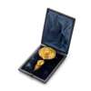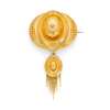 of oval outline with beaded detail throughout, glazed panel to reverse, suspending a smaller drop with fringed detail, unmarked, in a fitted box
