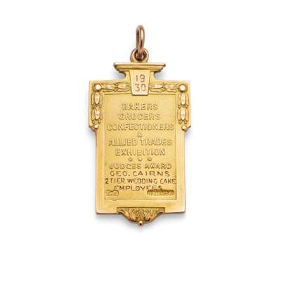 displaying the City of Glasgow coat of arms and motto with presentation inscription to reverse 1930 / Judges Award / Geo. Cairns / 2 Tier Wedding Cake / Employees, modelled in 9ct gold; in a fitted case for Edwards & Sons ... Glasgow