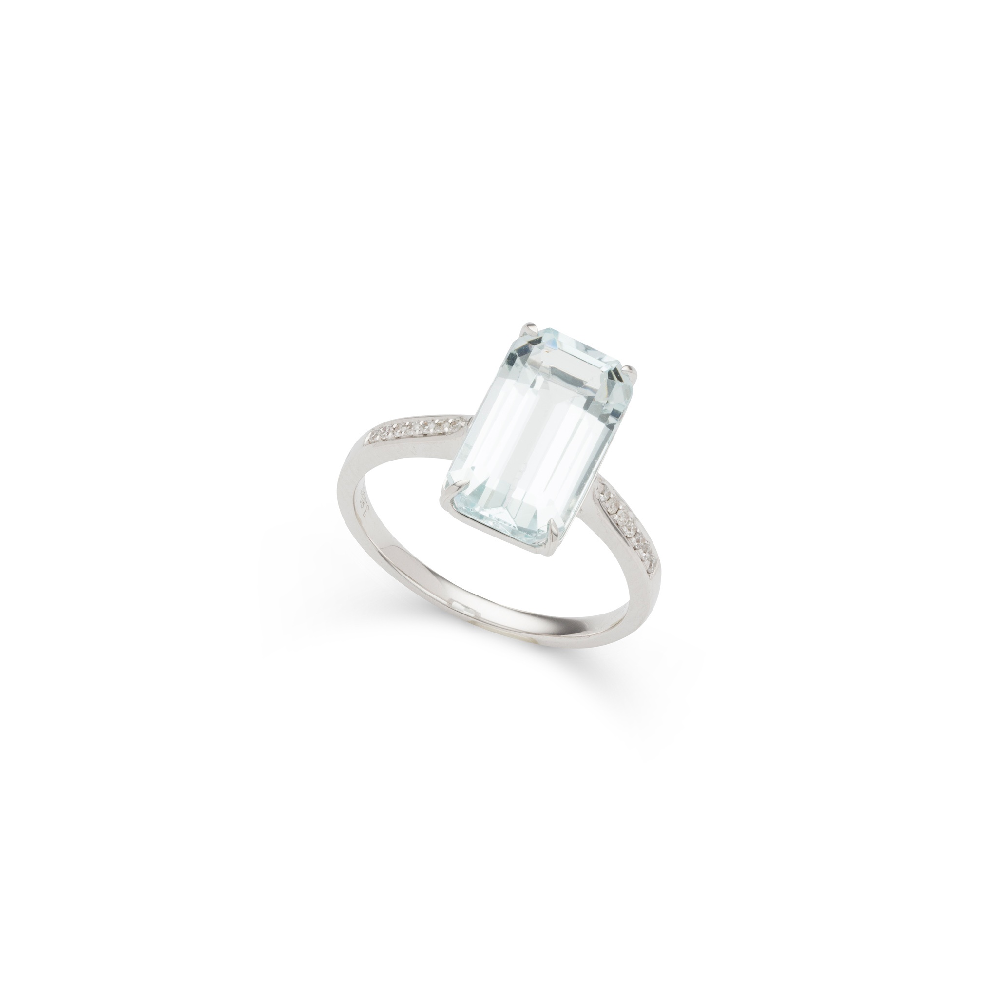 claw-set with a cut-cornered rectangular-cut aquamarine, each shoulder set with small round brilliant-cut diamonds, stamped Au750