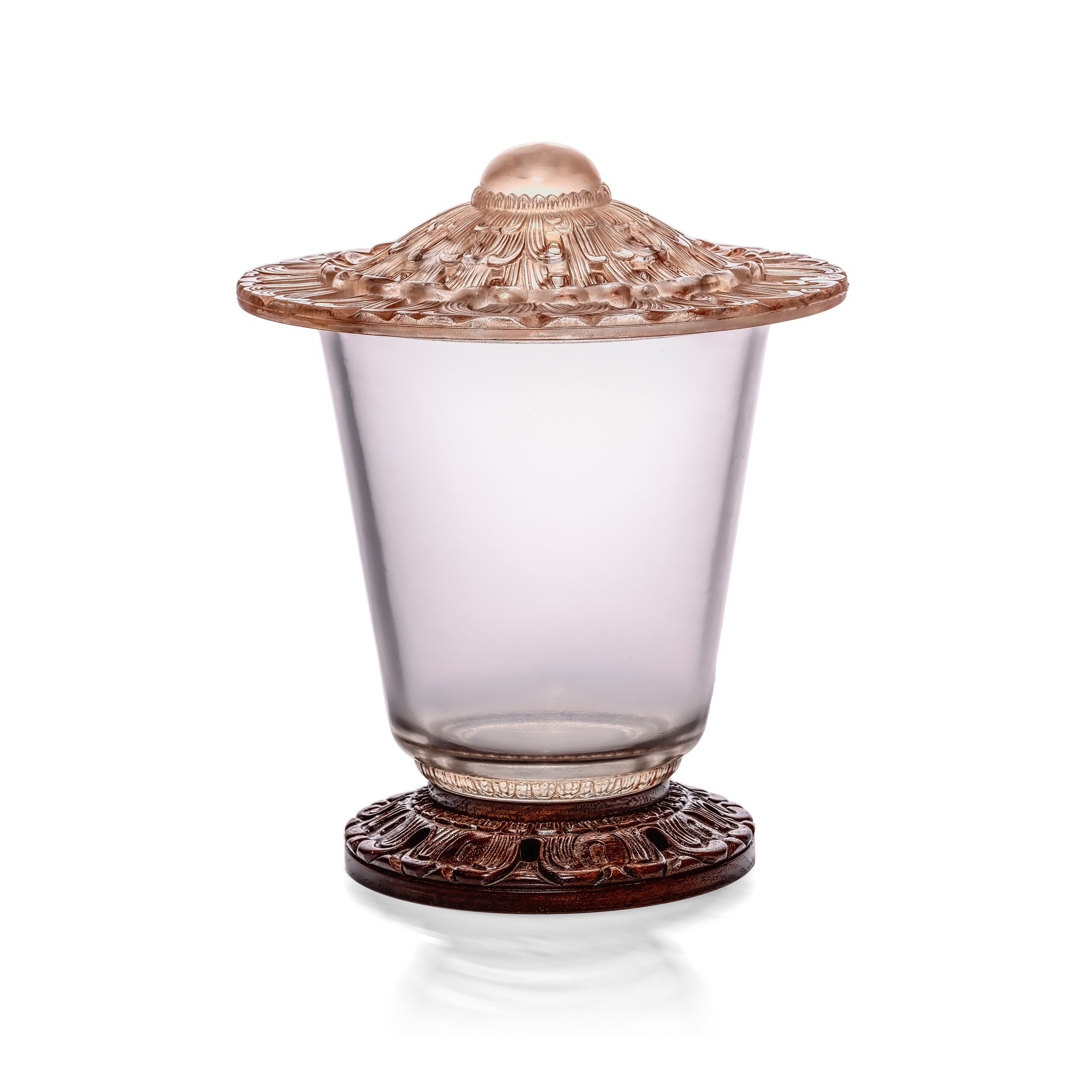 clear, frosted and sepia stained, on carved stained walnut base