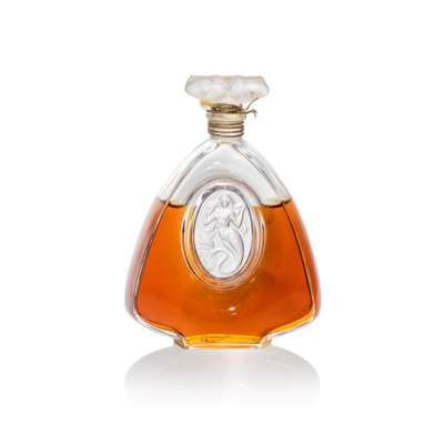 intaglio LALIQUE, applied paper label LA SIRÈNE DE BURMANN, box with applied paper label BURMANN 70 CHAMPS ELYSEES PARIS