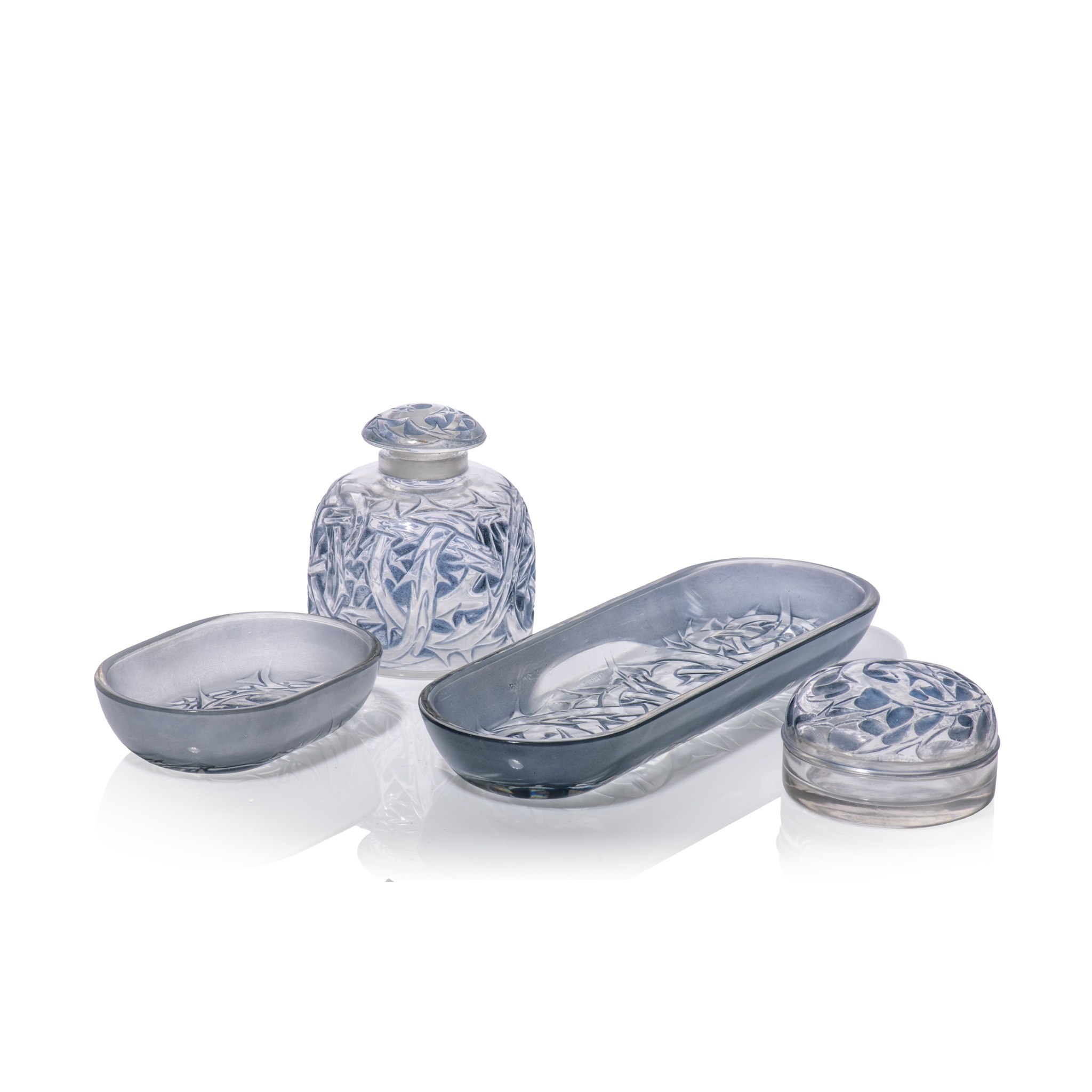 comprising scent bottle, tray, pot and cover and dish, clear, frosted and blue stained